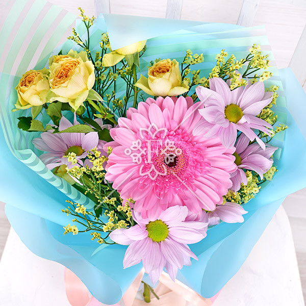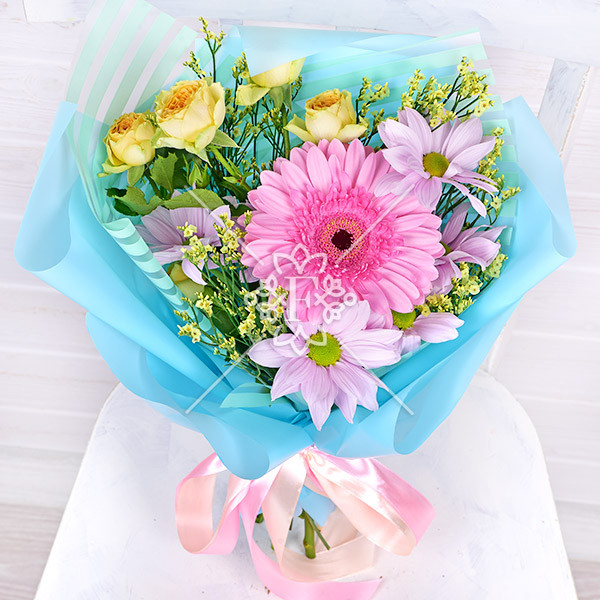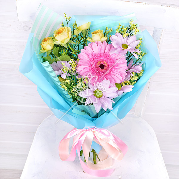 Гербера розовая- 1 шт., хризантема кустовая сиреневая -1 шт., роза желтая кустовая  - 1 шт., лимониум желтый – 1 шт., упаковка, лента.