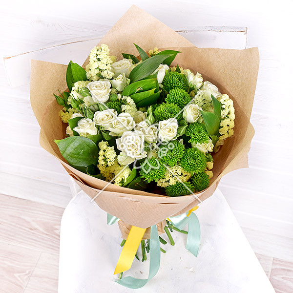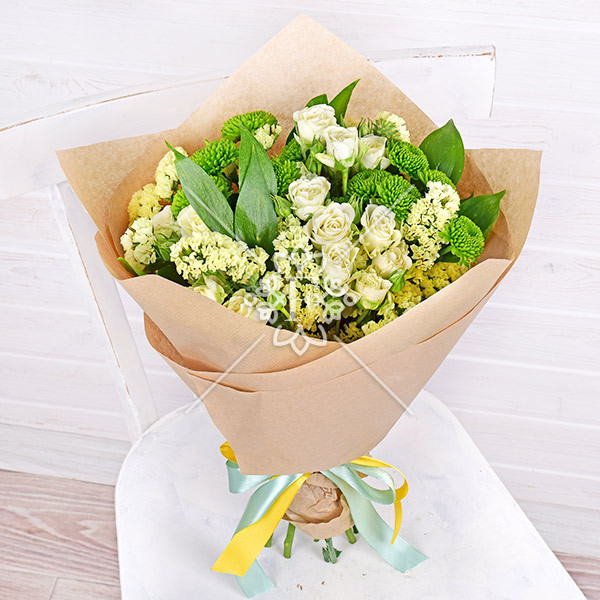 роза белая (кремовая) кустовая – 3 шт., хризантема зеленая кустовая – 2 шт., статица желтая – 2 шт., зелень декоративная (рускус) упаковка  крафт, лента.