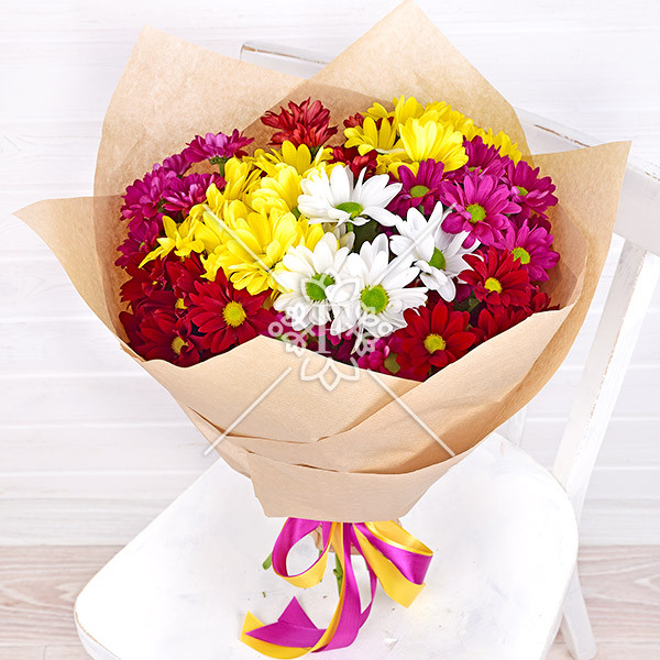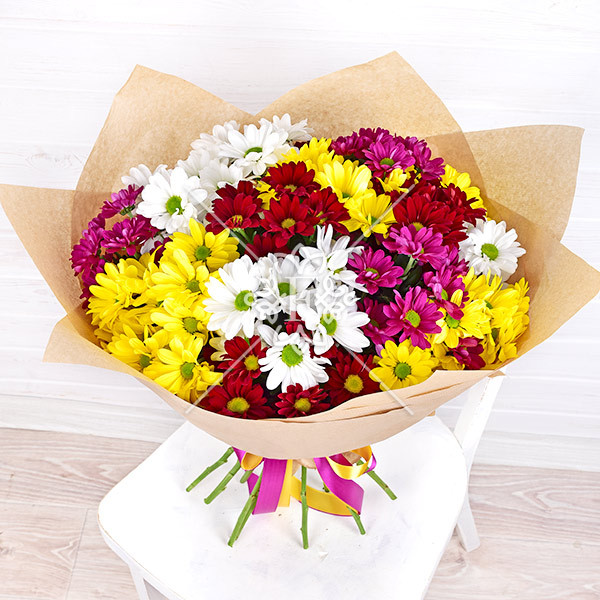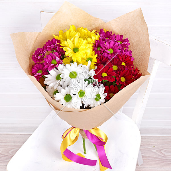 хризантема белая, желтая, красная, фиолетовая кустовая – 5 шт., упаковка крафт, лента.